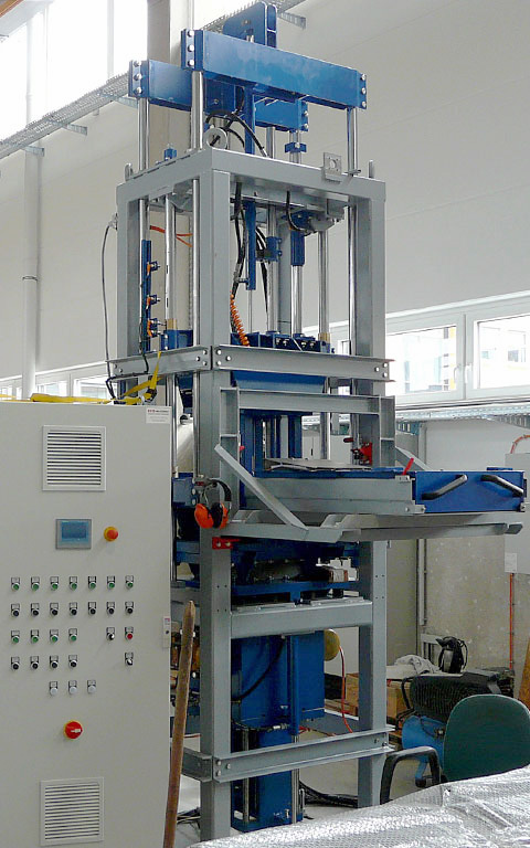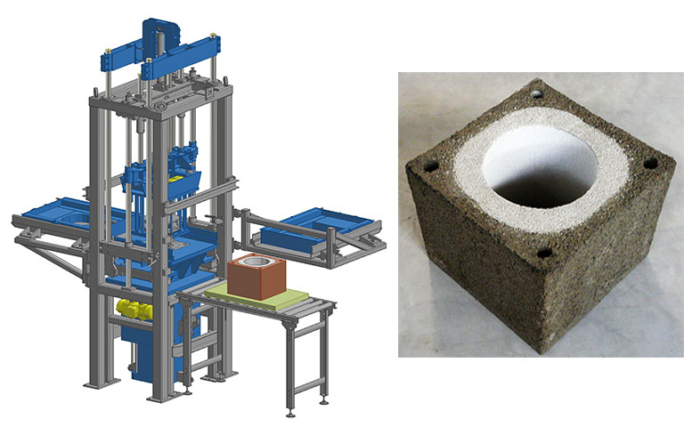 Um die Produktqualität und Maßhaltigkeit von Zweischalsteinen zu verbessern und die Produktionskosten zu optimieren, haben die Knauer Engineering GmbH Industrieanlagen & Co. KG und die IAB Weimar gGmbH einen innovativen Steinfertiger mit vertikalem Produktionsverfahren entwickelt. Der Fertiger verarbeitet zwei erdfeuchte Gemenge „frisch in frisch“ in nur einer Form zu einem hybriden Duplexstein mit einer Höhe von über 300 mm. Zunächst wird der Steinmantel gefertigt, der die Tragfunktion übernimmt. Dieser Mantel dient im Anschluss als Schalung für den dämmenden Kern. Dazu benötigt der neue Duplex-Steinfertiger lediglich einen Produktionsplatz. Der Stein verbleibt während der Fertigung an seinem Platz und wird erst am Zyklusende auf einer Standard-Unterlagsplatte abgestellt. Diese Verfahrensweise sorgt für eine vereinfachte Funktionsintegration und bietet viele Vorteile. Bei der Entwicklung des neuen Steinfertigers standen eine rasche Taktfolge und die geforderte Grünstandfestigkeit nach dem Entschalen der Produkte im Fokus.