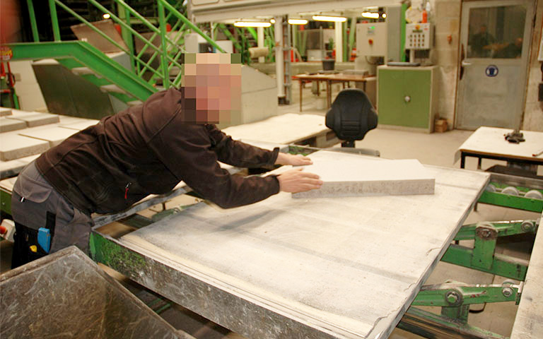 Mit dem automatisierten Qualitätssicherungssystem für die Betonsteinfertigung (QSS) werden mangelhafte Betonsteine schnell und ohne körperlich anstrengende Arbeiten direkt maschinell ausgetauscht.