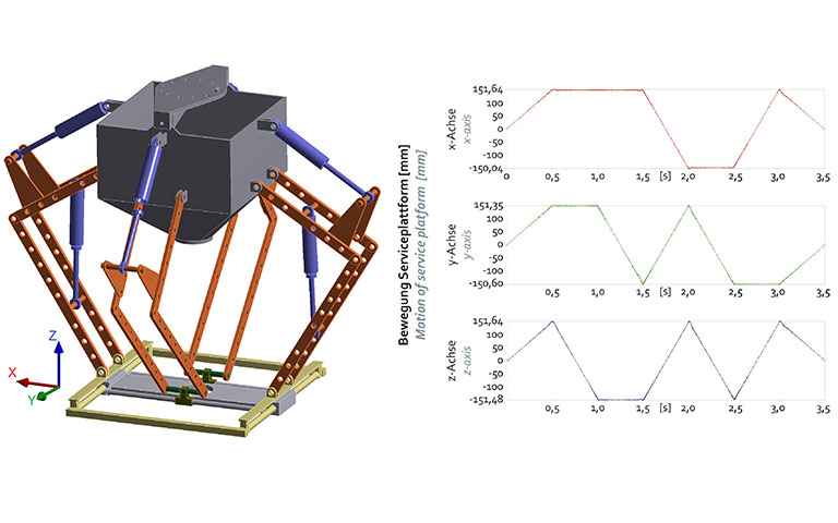 Ausgehend von verfügbaren Soll- und Ist-Koordinaten am Druckkopf berechnet ein eigens dafür entwickeltes Modell neue Stellgrößen für die Steuerung der Kompensator-Kinematik. Diese besteht aus einem trägen und einem dynamischen Modul, welche kaskadiert geschaltet sind. Das träge Kompensator-Modul regelt um seine Nulllage niederfrequente Störungen in drei translatorischen Raumrichtungen von ± 15 cm aus. Auf Grund der umgesetzten Kinematik ist perspektivisch auch die Ansteuerung eines rotatorischen Freiheitsgrades möglich. Das nachgeschaltete dynamische Kompensator-Modul soll höherfrequente Störungen und Stöße am Mastende beseitigen. Da es lediglich die vom trägen Modul nicht auszugleichenden Reststörungen quer zur fertigenden Wand übernimmt, ist zurzeit eine Steuerbewegung von ± 5 cm um seine Nulllage vorgesehen. Aus dem Stand können bis zu 4 kg in maximal 750 ms positioniert werden.
